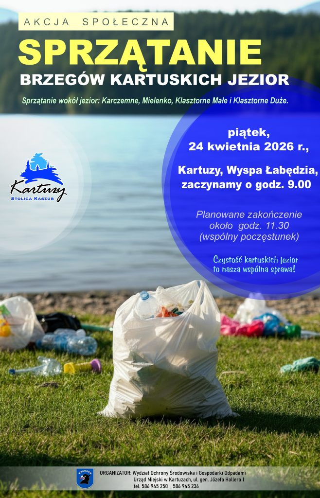 W imieniu Burmistrza Kartuz i Wydziału Gospodarki Odpadami i Ochrony Środowiska Urzędu Miejskiego serdecznie zapraszamy mieszkańców i wszystkie osoby chętne do udziału w akcji sprzątania jezior, która odbędzie się w piątek, 24 kwietnia, w godzinach od 9:00 do 12:00. Miejscem zbiórki uczestników będzie Wyspa Łabędzia.